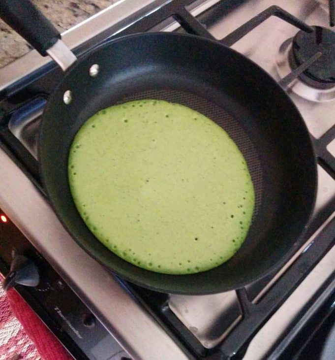 2Despeje uma concha de massa numa frigideira grande antiaderente. Gire a frigideira para a massa se espalhar e doure dos dois lados. Repita com a massa restante.
